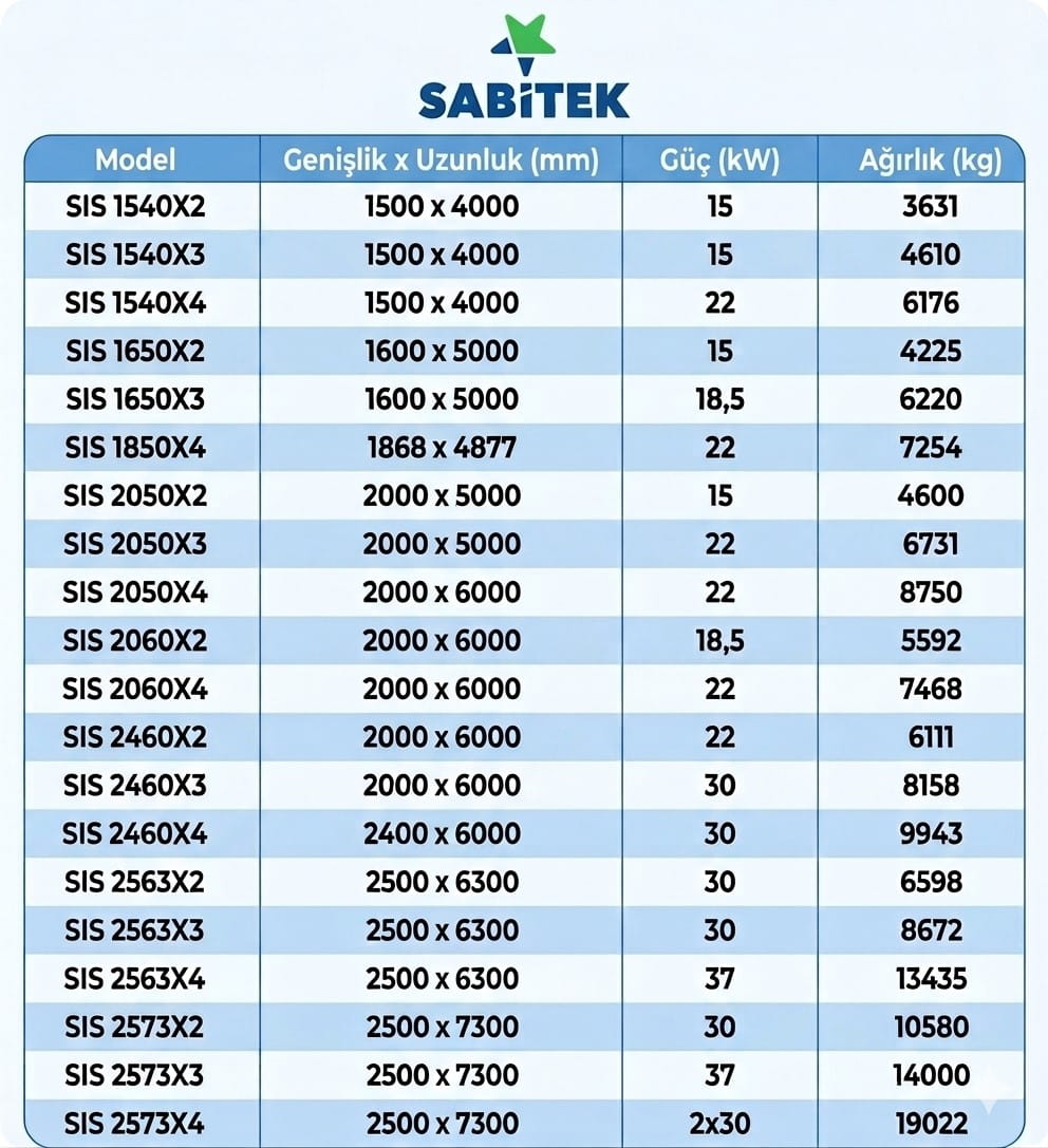 - Ağırlık Kapsamı: Tablodaki ağırlıklara tahrik motoru paketi, destek ayakları, bakım platformu ve giriş/çıkış olukları dahil değildir.